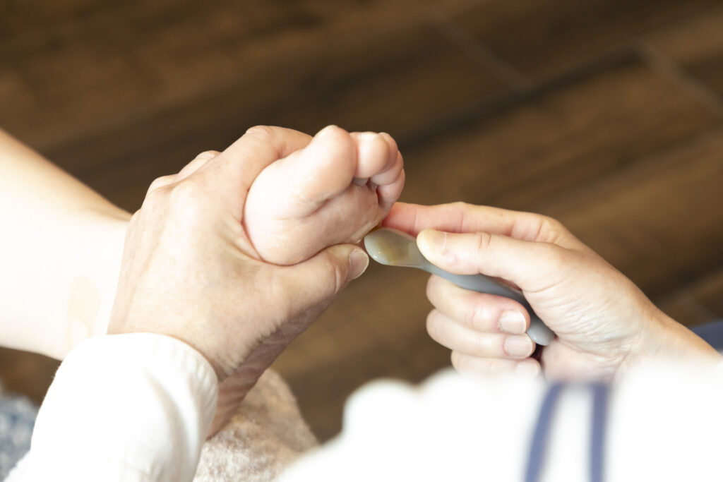 当サロンの足もみでは、手のぬくもりに加え、天然石のメノウを使ってほぐしていきます。私が使用するメノウは、ほどよい重みと細やかなポイントに届く形状が特長です。その形を活かし、足裏の反射区や滞りを感じる部分へ、繊細に、そして的確にアプローチしていきます。